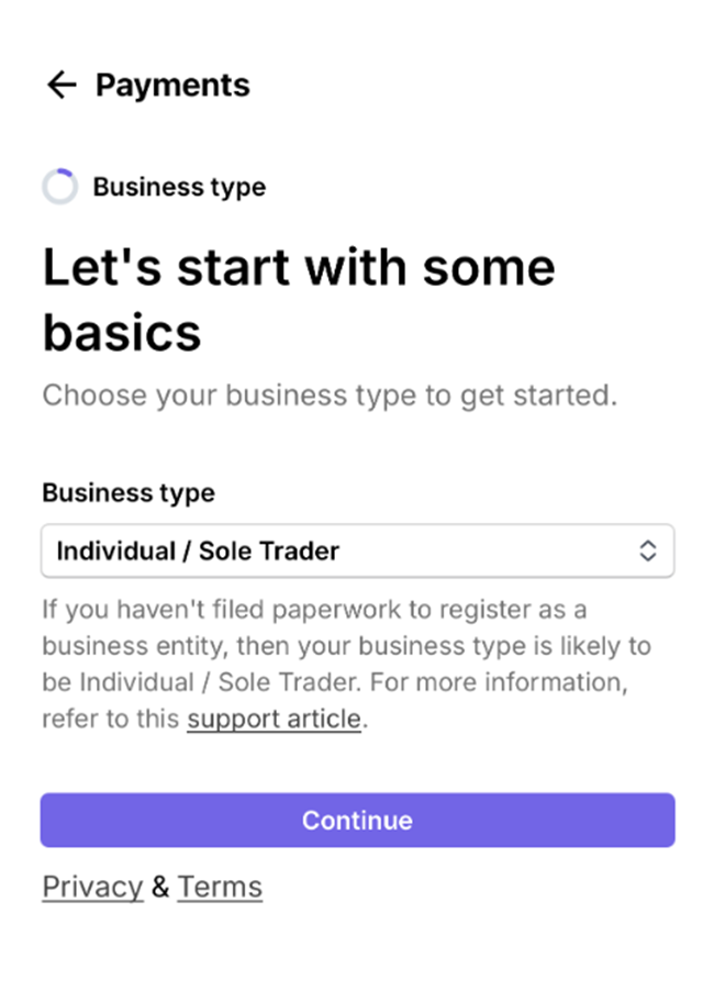 Start by selecting your business type from the drop-down menu. You can choose from the following options: Individual/Sole Trader, Company, or Non-Profit. Once you’ve made your selection, tap Continue to proceed.