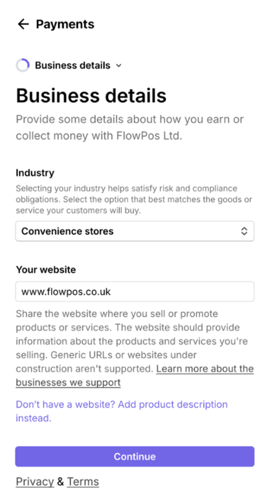Now, enter your business details. In this section, provide your business website address and select your industry type from the available options. This helps us tailor your account to your business needs.