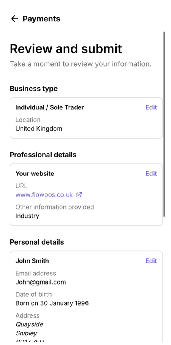Finally, review all the information you’ve entered to ensure it is correct, then submit your details. Your payment profile is now on boarded.