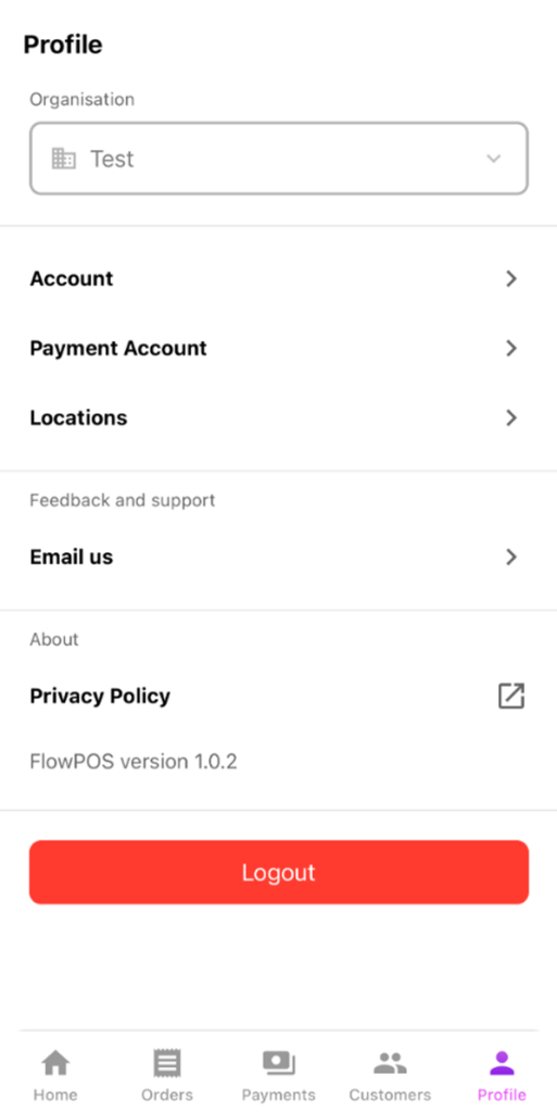 Once you’ve downloaded the Flow POS app from your device’s app store, open the app and tap Profile in the bottom-right corner. On the Profile page, you’ll see several options – select Payment Account to begin setting up your payment details.